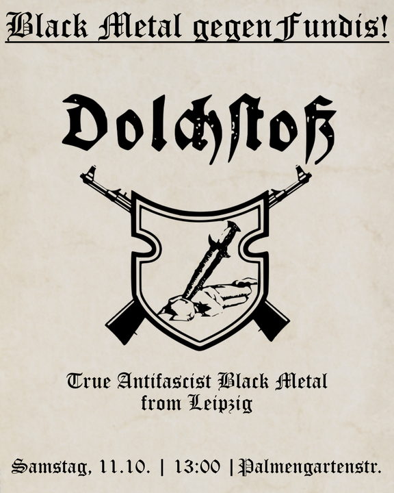 Neben Redebeiträgen freuen wir uns über musikalische Untermalung von Dolchstosz (Trve Antifascist Black Metal from Leipzig):